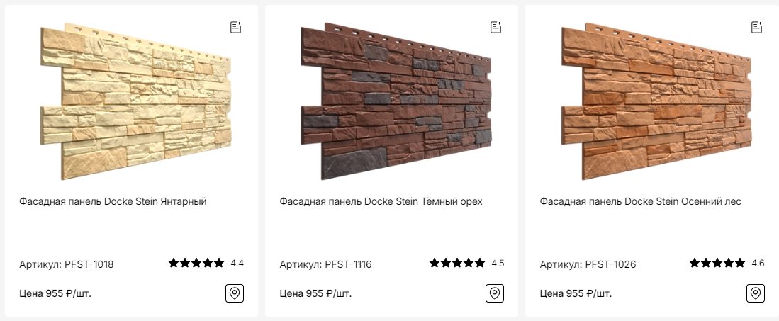 Еще один вариант – это виниловые фасадные панели. Размеры из 1,1 х 0,4 м. Площадь 0,44 кв.м. Цена от 955 р за штуку или 2387 р за квадратный метр, не считая доборных элементов. Благодаря современным добавкам они не выцветают и устойчивы к осадкам и низким температурам, не поддерживают горение.